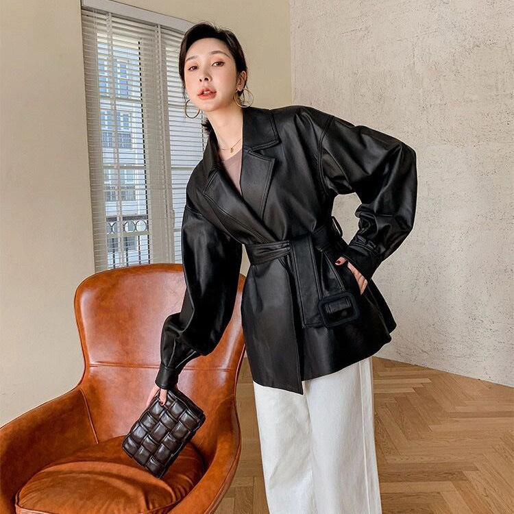 Home / Man Trench / All-match Loose Belt Small Leather Jacket